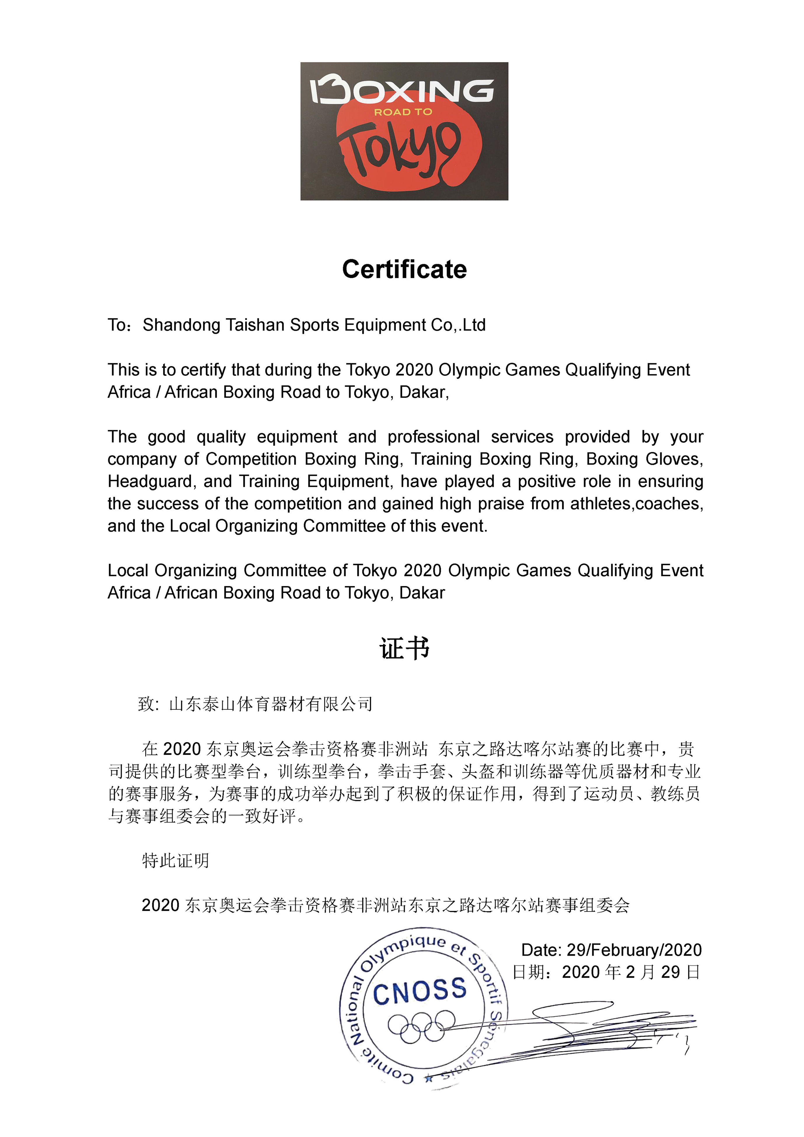 2020年东京奥运会拳击资格赛非洲站证书